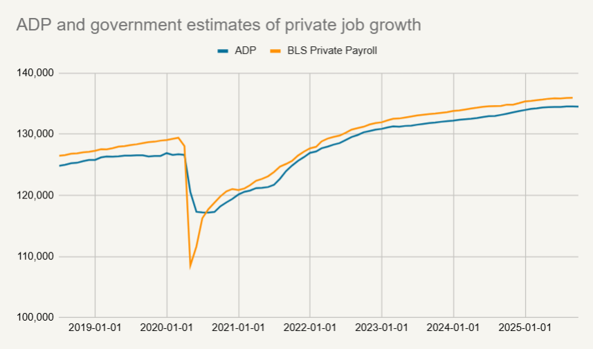We say mostly because there are a wide variety of data sources available that don’t rely on government statistics. For employment, ADP, which is a large private payroll provider, has been publishing an estimate of private job growth for many years. While there can be significant differences between ADP’s estimate and the official Bureau of Labor Statistics estimate of job growth in a given month, over time the two track each other very closely.