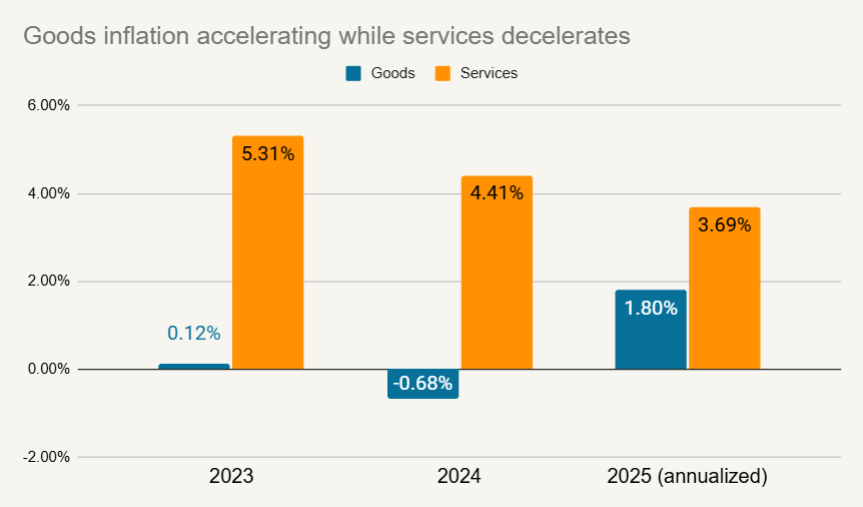 Tariffs are logically going to mostly hit physical goods, whereas most services don’t trade across borders. So the fact that goods inflation is accelerating while services is decelerating does suggest tariffs are causing most of the recent uptick in inflation.