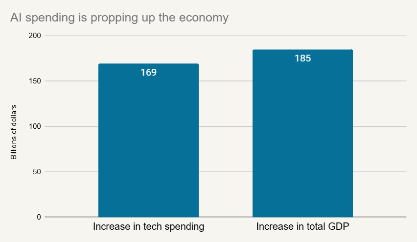 This means that if we took out all growth in tech spending, which has probably mostly been driven by AI spending, GDP wouldn’t have grown at all so far in 2025.