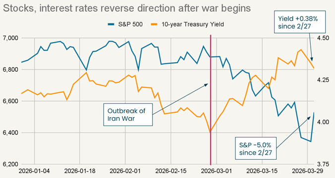 The outbreak of war in Iran caused a significant shock through the financial system. Below is a chart of the S&P 500 price and the 10-year Treasury bond yield. I drew a red line on February 27, the last trading day before U.S. and Israeli strikes began.