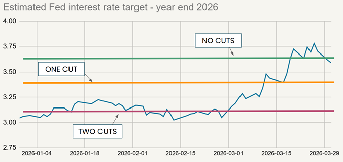 We can see this by looking at futures contracts on the Fed’s target rate. Prior to the start of the war, markets were expecting two rate cuts in 2026, which some odds of a third cut. Now those cut expectations have been all but erased.