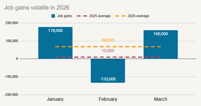 However, this benign average belies a lot of volatility. So far this year, the labor department has reported strong gains in January and March, but in between there was a sharp decline in employment in February.