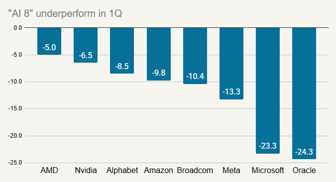 What we did see this quarter is how AI could create winners and losers, perhaps in some surprising ways. In January, Anthropic (parent company of Claude) announced a new plugin to help with legal contract review. This touched off a substantial drop in software and business services stocks, which has been dubbed the SaaSpocalypse (“SaaS” standing for “software as a service”). In 1Q, the software segment of the S&P 500 was down 23%.