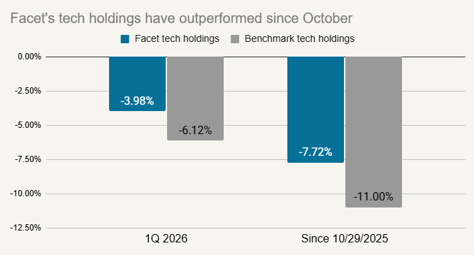 This shift from AI euphoria to a more measured attitude has been a big boost for Facet’s performance relative to benchmark. Our mix of ETFs is tilted toward companies with higher profit margins, more stable revenues, and lower debt levels. In other words, more stable, less speculative companies. In tech specifically, there was meaningful underperformance from these more speculative companies, fueling outperformance for Facet’s tech mix. This divergence is even more stark if we rewind back to October 29, which was the recent peak for the tech sector.