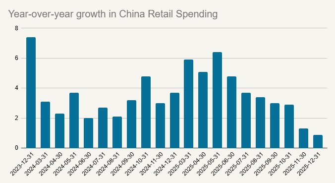 China has been dealing with the fallout of its property market bust for several years now. In the middle of 2025, there seemed to be some signs of recovery, but the most recent data has taken a turn for the worse. The graph below shows retail spending growth, but this pattern would follow for everything from property prices to good imports. There is no clear end in sight for China’s economic woes.