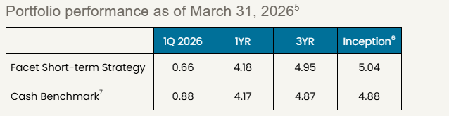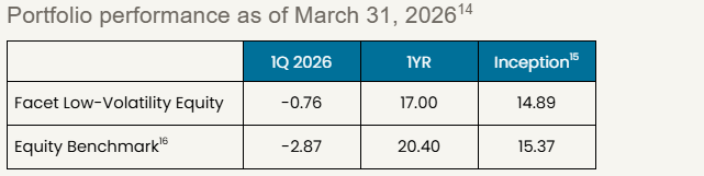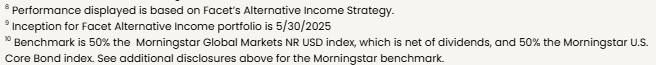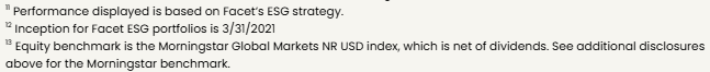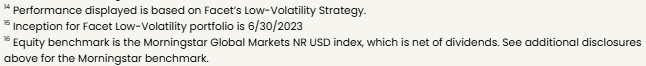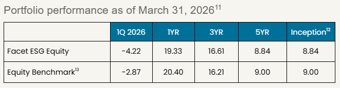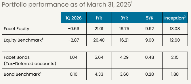 Benchmarks: For each portfolio, Facet chooses a benchmark that best represents Performance disclosure. Past performance is not indicative of future returns .Investment returns shown here are intended for illustrative purposes only. All investments involve risk, including the potential for the loss of principal. The portfolio performance of Facet strategies began in 2018. Effective December 31, 2025, Facet transitioned to use composite performance, which represents the actual asset-weighted investment experience of a group of member portfolios managed to a specific strategy. Performance results for the current quarter period are calculated using portfolio accounting software and represent actual member results (composite performance).