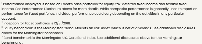 The Morningstar Global Markets Index NR USD and US Core Bond indices have been licensed by Facet for use for certain purposes. The services provided by Facet are not sponsored, endorsed, sold, or promoted by Morningstar, Inc. or any of its affiliated companies (all such entities, collectively, “Morningstar Entities”). The Morningstar Entities make no representation regarding such services. All information is provided for informational purposes only. The Morningstar Entities do not guarantee the accuracy and/or the completeness of the Morningstar Indexes or any data included therein. The Morningstar Entities make no warranty, express or implied, as to the results to be obtained by the use of the Morningstar Indexes or any data included therein. The Morningstar Entities make no express or implied warranties and expressly disclaim all warranties of merchantability or fitness for a particular purpose or use with respect to the Morningstar Indexes or any data included therein. Without limiting any of the foregoing, in no event shall the Morningstar Entities or Morningstar’s third-party content providers have any liability for any special, punitive, indirect, or consequential damages (including lost profits), even if notified of the possibility of such damages.