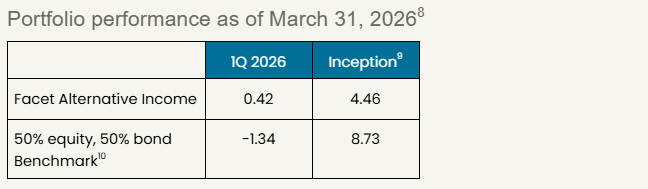 This is why Facet built our Alternative Income strategy to be as diversified as it is. We don’t just use direct lending, but also asset-based lending, real estate, and public markets credit. This enhances the liquidity of our funds, and could help provide some protection from sector-level events like the current struggles in software. Note that the Alternative Income strategy outperformed both our primary stock and bond strategies so far in 2026.