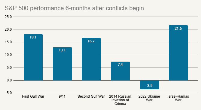 One simple way to see this unpredictability is to look at stock market performance surrounding major conflicts in the past. Historically, while the initial shock of a conflict can cause a dip, the S&P 500 has often trended upward in the six months following the start of hostilities.