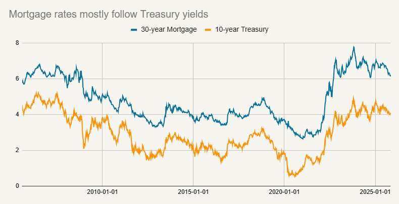 - A significant drop in mortgage rates, possibly into the low 5% range, would likely require a U.S. recession, forcing the Fed to cut rates more aggressively than the 2-3 cuts currently expected.