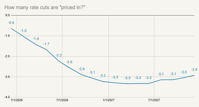 Where there are decimals, think of that like traders being split between the number of cuts. For example, in March 2026, there are 1.4 cuts “priced in.” Obviously the Fed won’t actually cut 1.4 times. Rather think of this as traders thinking there will definitely be one more cut by then, and approximately 40% odds of a second cut.