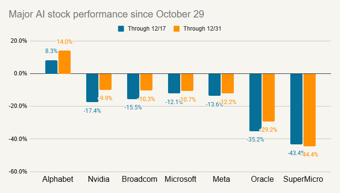 However, this quarter there was some volatility among AI-related stocks. The S&P 500 tech sector hit a high on October 29, but then dropped nearly 10% between then and mid-December before recovering a bit into year-end. Some of the AI darlings were among the stocks hit the hardest.