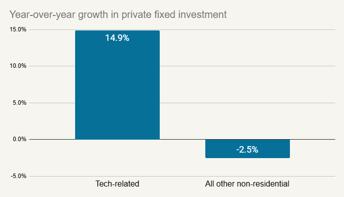 Here’s where this time could be different. Fixed investment is actually quite strong right now, growing at a 5.5% pace over the last year. This appears to be driven mostly by all the AI-related spending. If we dig into the details of the BEA’s GDP report you can see private fixed investment by category. If we sum up the “Information processing equipment” plus the “Software” categories and call that “Tech-related” we can see that accounts for more than 100% of all growth in non-residential fixed investment.