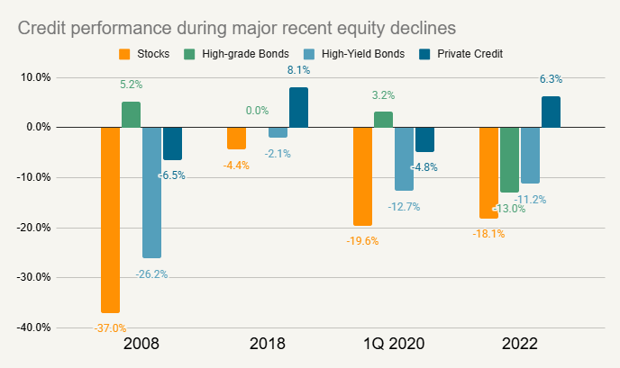 Source: Dow Jones S&P Indices (stocks), Bloomberg Aggregate (high-grade bonds), Bloomberg Corporate High-Yield (high-yield bonds), Cliffwater (private credit)
