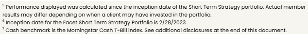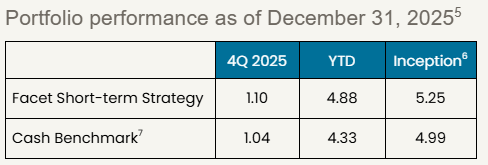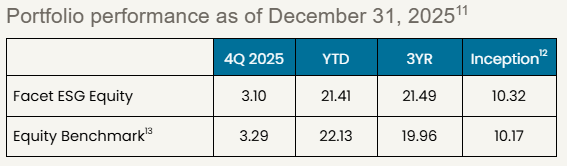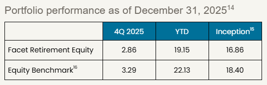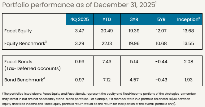 Past performance is not indicative of future returns .Investment returns shown here are intended for illustrative purposes only. All investments involve risk, including the potential for the loss of principal. The portfolio performance of Facet strategies began in 2018. Effective December 31, 2025, Facet transitioned to use composite performance, which represents the actual asset-weighted investment experience of a group of member portfolios managed to a specific strategy. Performance results for the current quarter period are calculated using portfolio accounting software and represent actual member results (composite performance).