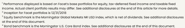 Calculations for the 12-month, 3-year, and Since Inception periods were performed using the Bloomberg Portfolio Analytics tool. Performance was calculated using Facet’s most common recommended equity and fixed-income ETF portfolios. At times when Facet changed a recommended ETF, the average transaction price of both buys and sells was used to update the portfolio. Otherwise, the portfolio was rebalanced monthly. This illustration is meant to most closely resemble what a common Facet member in a given asset allocation mix may have returned.