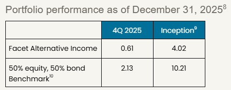 Facet launched the Alternative Income Strategy in April, so these results only reflect about eight months of performance. In that short period, the strategy is performing as we would expect. The strategy uses a combination of private credit, private real estate and some public market credit instruments to produce a high level of current income.