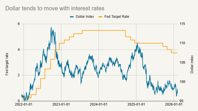 Here we see the dollar surging in 2022 as the Fed was hiking rates. It then levels out as the market starts anticipating that the hiking cycle is over. The dollar dips in late 2024 when the Fed starts cutting, then rebounds when the Fed pauses cuts in early 2025. It drops again starting mid-2025 when it becomes clear the Fed is going to resume cuts.