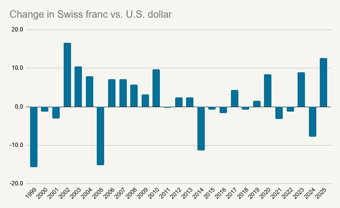 If you were to do something like open a savings account in Switzerland, you would actually be creating a currency problem. Assuming you have no bills that are denominated in Swiss francs, you’ll need to convert that money to dollars when you need to use it. What if the franc weakens vs. the dollar? Suddenly your bills will have become much more expensive, very similar to the company example we gave above. Note that currencies can be very volatile. Since 1999 the Swiss franc has suffered 12 negative years. The U.S. stock market has only had six losing years in that time.