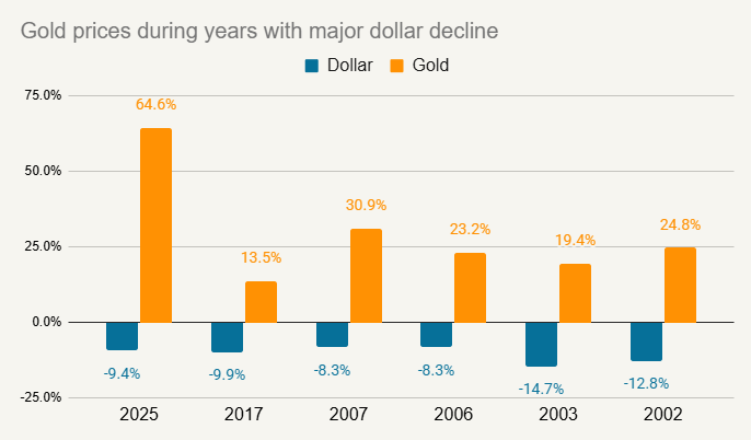 Gold has traditionally been a reasonable hedge against a declining dollar, and 2025 was no exception. Gold up a staggering 65% in 2025 as the dollar slumped 9%. Based on history, it would seem likely that if the dollar declines again in 2026, gold prices could keep rising.